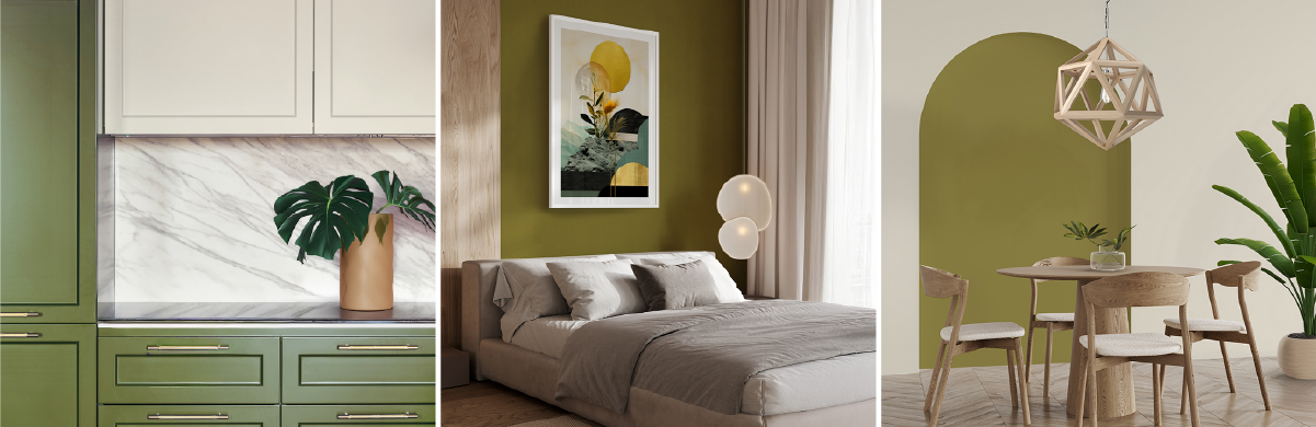 - Introduce Olive Spark on feature walls, cabinetry, or furniture for grounding depth.